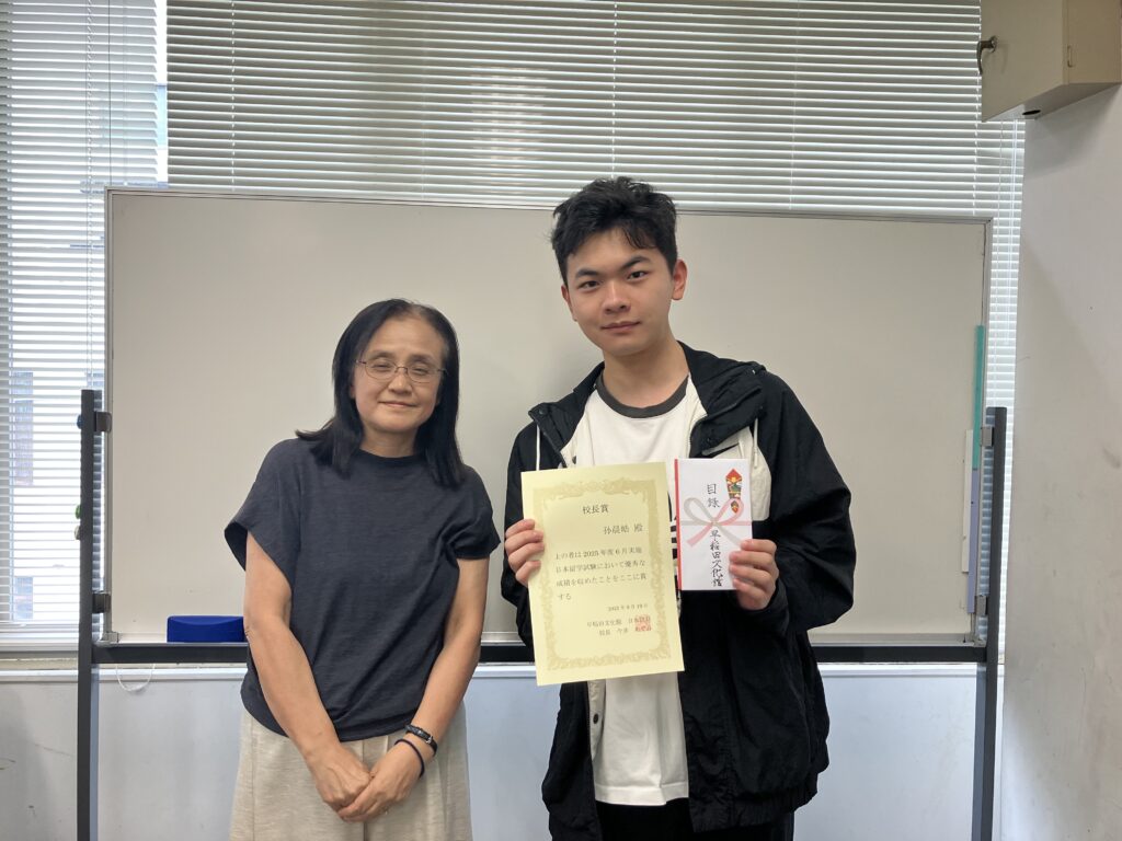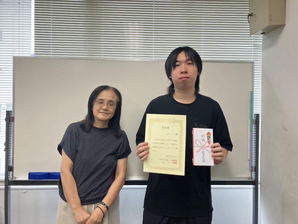 本校の学生が、日本留学試験(EJU)と実用日本語検定(J.TEST)で素晴らしい成果をあげ、「校長賞」を受賞しました✨